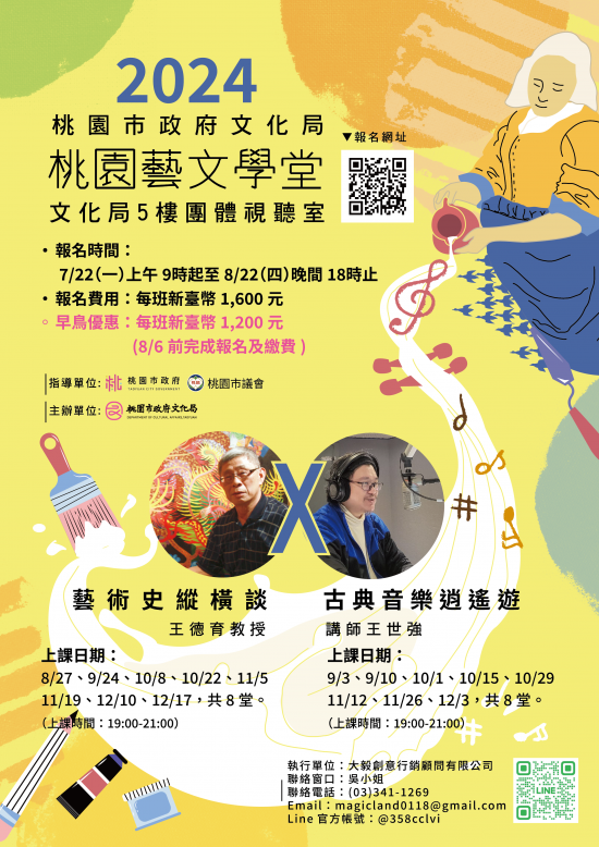 | 1、 | 藝術史縱橫談:王德育老師(前元智大學藝術管理研究所副教授、教授兼所長暨藝術中心主任)。 |