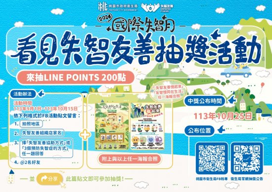 | 四、 | 相關活動資訊如附件,亦可至該局網站( https://dph.tycg.gov.tw/,首頁>業務資訊>健康促進服務>慢性病防治>113 年看見失智友善-線上抽獎活動)查詢。 |