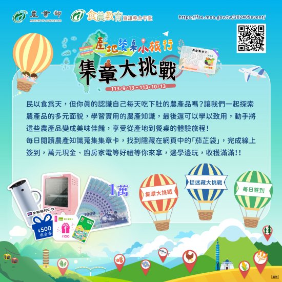 | 四、 | 為使大眾更加瞭解食農教育並探索在地農產,預訂於 113 年 9 月 13 日至 10 月 13 日舉辦「產地到餐桌小旅行 集章大挑戰」食農教育推廣活動( https://fae.moa.gov.tw/202409event/),提供食農教育相關知識集章挑戰、網頁捉迷藏、簽到打卡等遊戲,參與活動即可抽獎,包含萬元現金、廚房家電、禮券等多項好禮,歡迎踴躍參與。 |