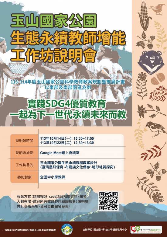 | 主旨: | 檢送國立臺中科技大學辦理「玉山國家公園生態永續教師增能工作坊說明會」之招募文宣及宣傳海報各 1 份,請查照。 |