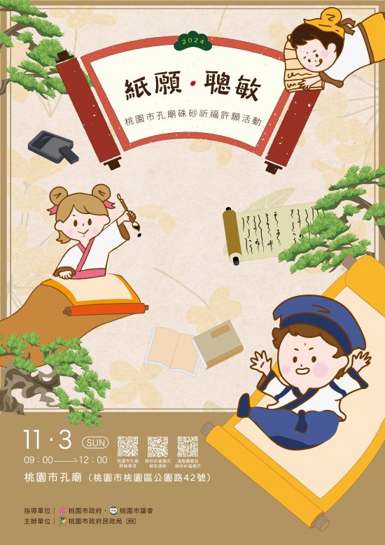 | 二、 | 旨揭活動時間訂於 113 年 11 月 3 日(星期日)上午 9 時至 12 時,於桃園市孔廟(桃園市公園路 42 號)辦理,凡報名參加硃砂祈福儀式之學子將贈送祈福便條紙一份,報名時間自 10 月 22 日起至額滿為止,提供線上報名網址 https://reurl.cc/Mjxo4k 。 |