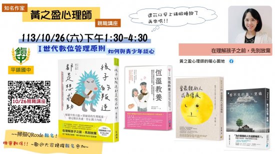 | 三、 | 本場講座特邀暢銷書作家【黃之盈心理師】,著有《孩子的叛逆,都是想求助》《恆溫教養》《當最親的人成為傷痕》《從此,不再複製父母婚姻: 35 種練習,揮別婚姻地雷,找回幸福》 《看不見的傷,更痛:療癒原生家庭的傷痛,把自己愛回來》等熱銷書籍。講座機會難得,歡迎家長、教師報名參加。 |
