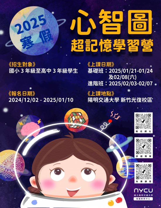 | 主旨: | 檢送本校推廣教育中心辦理「心智圖超記憶親子免費講座」及「2025 寒假-心智圖超記憶學習營」招生簡章及海報,敬請惠予公告周知,請查照。 |