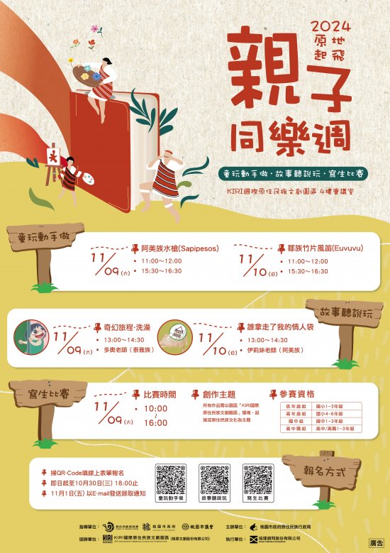 | (一) | 活動緣起:本次活動旨在透過富有互動性和趣味性的多元親子活動,帶領民眾認識原住民族文化,其中「童玩動手做」將由講師引導參與者製作原住民傳統童玩,展現原住民族對自然資源的巧妙運用和深厚的工藝技術;「故事聽說玩」將由講師精心挑選的繪本,帶領參與者以聽、說、玩的形式探索原住民族的歷史、習俗及生活方式;「寫生比賽」鼓勵參與者覺察「KIRI 國際原住民族文創園區」景觀環境,再透過畫筆表達對周遭環境及原住民族文化的理解與感受。期盼一系列的親子活動促使參與者透過親身體驗增進對原住民族多元文化的理解與尊重,並促進社會文化交流與共榮。 |
