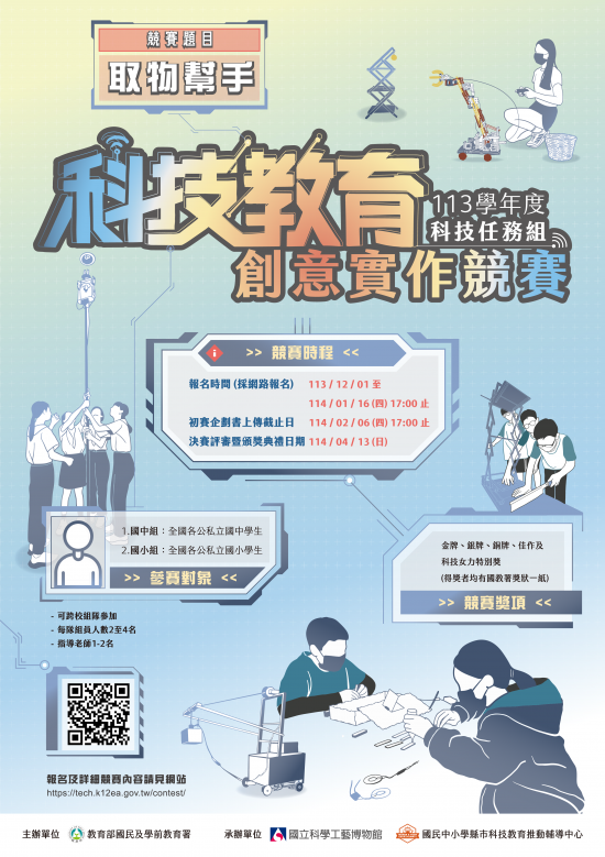 | 三、 | 本案限網路報名,報名時間自 113 年 12 月 1 日至 114 年 1 月 16 日(星期四)下午 5 時止,詳細競賽資訊可參閱網頁: https://tech.k12ea.gov.tw/contest/。 |