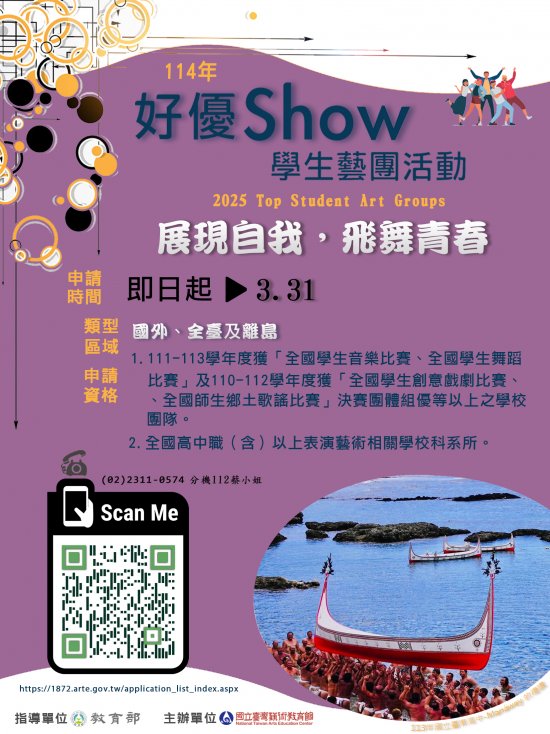 | 二、 | 為鼓勵並持續提供全國表演藝術學校優等以上團隊至全臺各地、離島及國外等展演機會,豐富學習歷程;鼓勵學生透過展演,彼此觀摩學習,充實美感體驗並透過專業藝術教育課程分享,提升學生學習視野,特辦理 114 年好優 Show 學生藝團活動徵選。 |