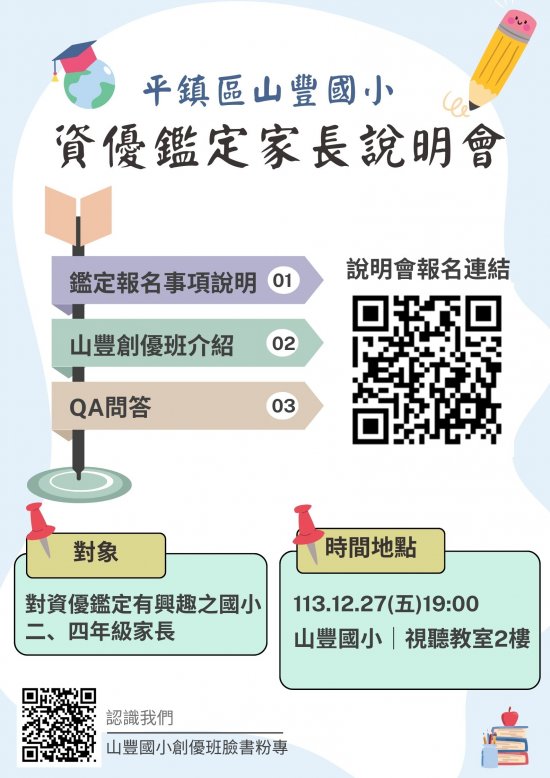 二、 為使家長充分了解鑑定相關事項及本校資優教育課程規 劃,特舉辦此說明會,歡迎家長踴躍參加。