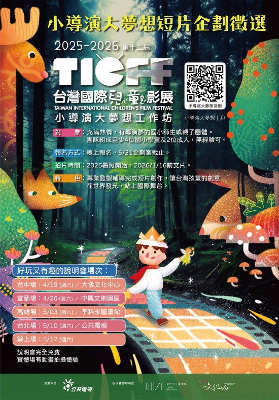 | 三、 | 「兒童短片企劃案徵選」於 2025/5/31 截止收件,歡迎國小師生、親子團隊組隊上網報名。提出拍片企劃參加徵選,入選團隊可享整套拍片輔導資源,完成短片擇優送國際參展。相關活動細節請上活動官網 https://www.pts.org.tw/dreamer12/ |
