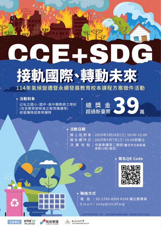 | 主旨: | 敬邀 貴校推派代表報名參加「CCESDG 接軌國際、轉動未來- 114 年氣候變遷教育暨永續發展教育校本課程方案徵件活動」,惠請 協助公告宣傳,請查照周知。 |
