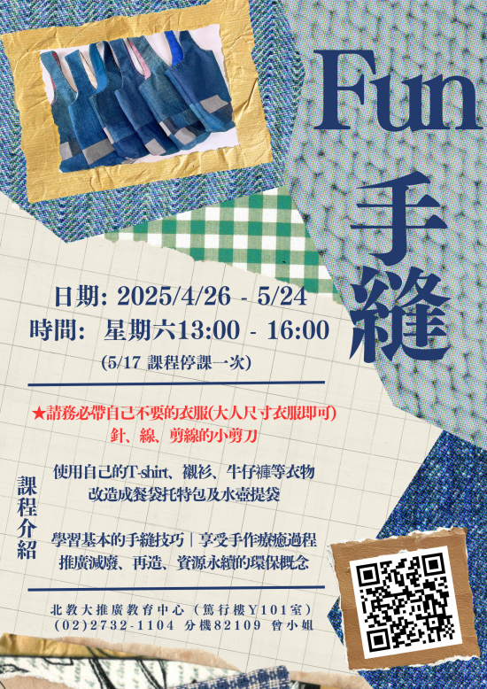 | 主旨: | 本校推廣教育中心辦理「Fun 手縫(HandMay 五月場)」縫紉課程招生訊息,鼓勵踴躍報名參加,請查照。 |